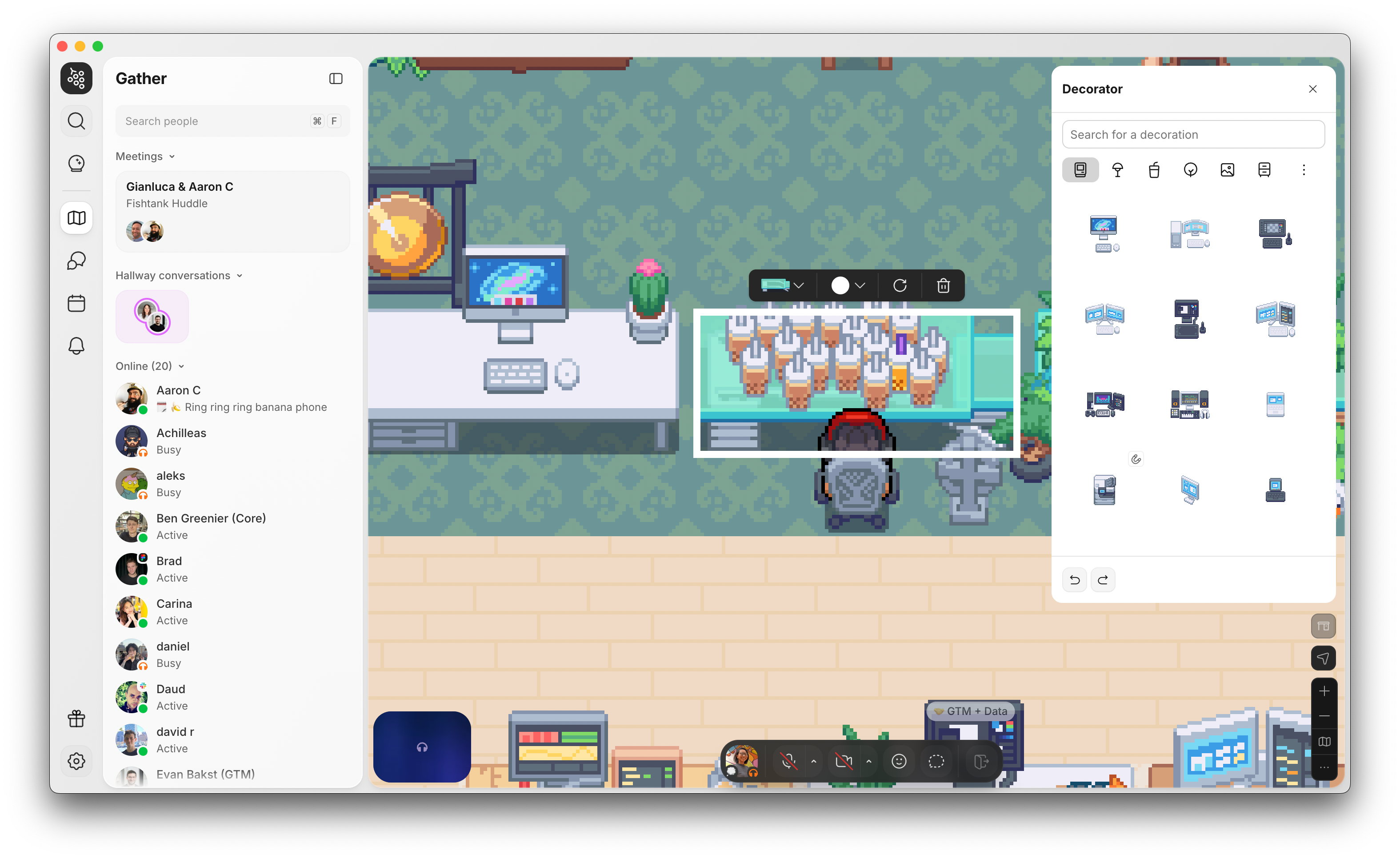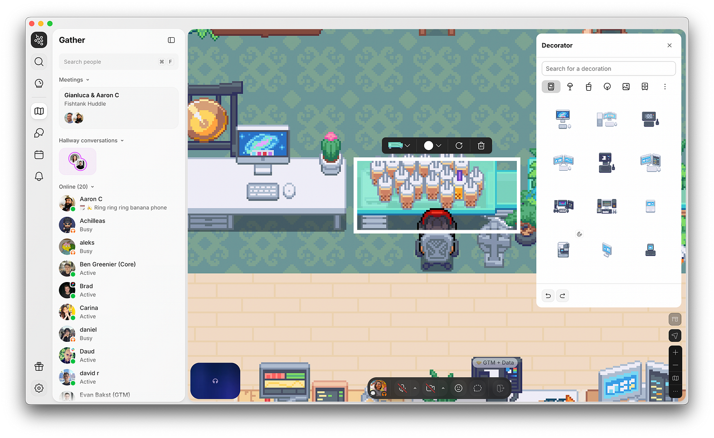 In mid-2024, we gained conviction internally to rewrite Gather with remote work as a first class citizen. This rewrite also gave us the opportunity to completely redesign our map models from the ground up, an effort we had already attempted once and iced a year prior. This was an extremely chaotic (and fun!) time where we were building on top of a new platform with evolving interfaces. Our saving grace was at this point Gather had supported remote offices for two years and we were deeply familiar with the use cases we needed to achieve parity or unblock. This helped us to see around corners and make an opinionated ~6 month roadmap to ship Studio (a la Mapmaker 2.0), Decorator (our in-app map-building tool) and other complementary tools.