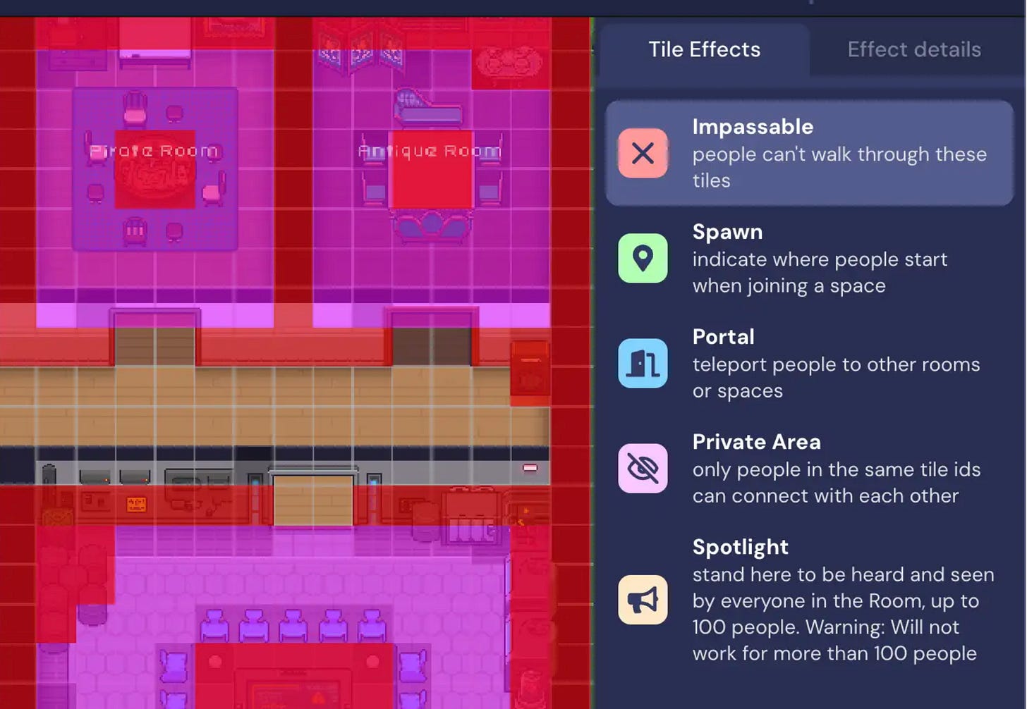 MapAreawithout changing all children’s coordinates (which saves a ton of writes to the database).Tile effects are no longer a property exposed to the user. Our art team still uses it to label how an object is impassable, e.g. a tall plant has a single impassable base tile.