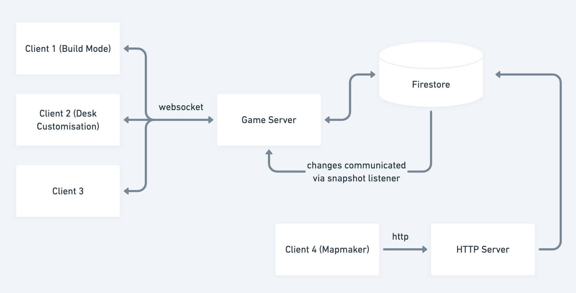 When Gather expanded to supporting remote offices, we built real-time features that allowed users to decorate their desks in app. All real-time collaborative features had to communicate with our stateful game servers via websockets so changes can be propagated to all online clients connected to the same space. We very quickly ended up with 3 divergent map-building tools on 2 different architectures that didn’t talk to each other.